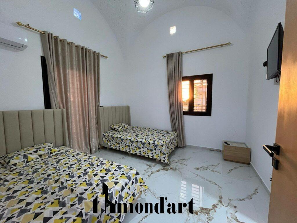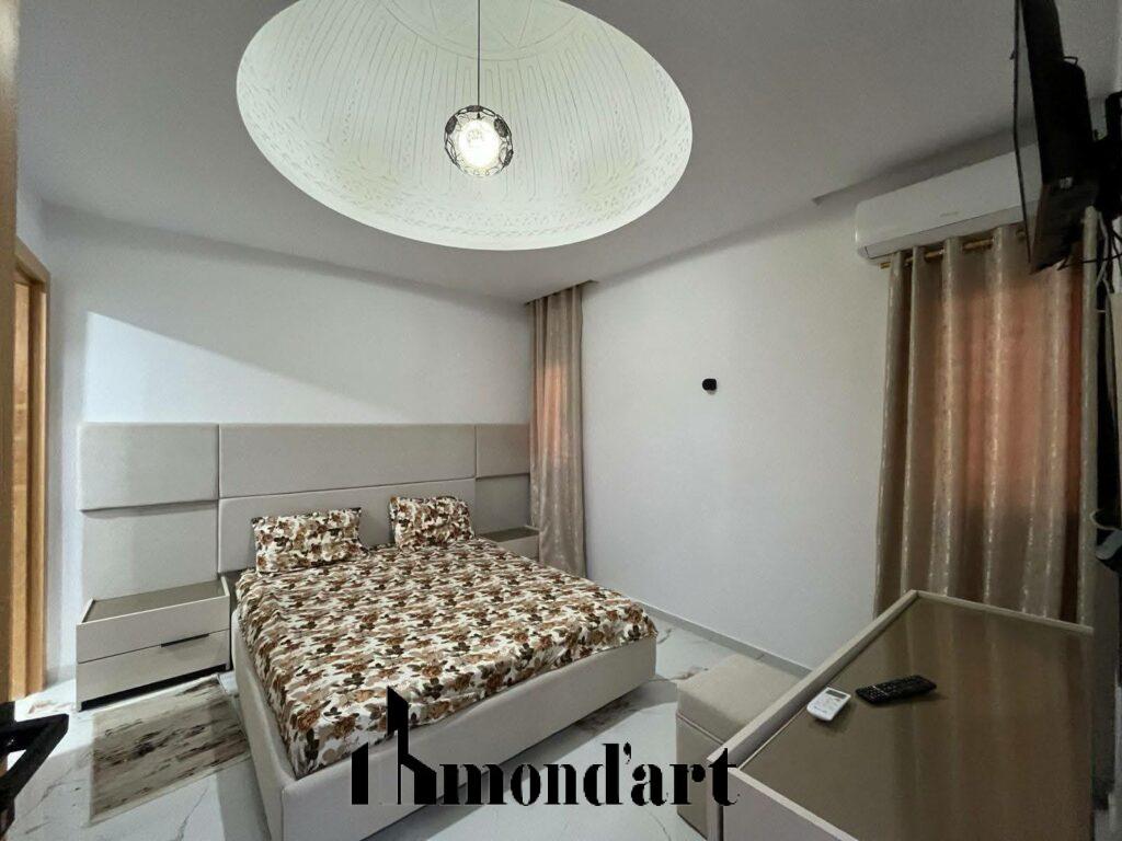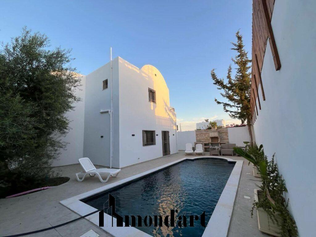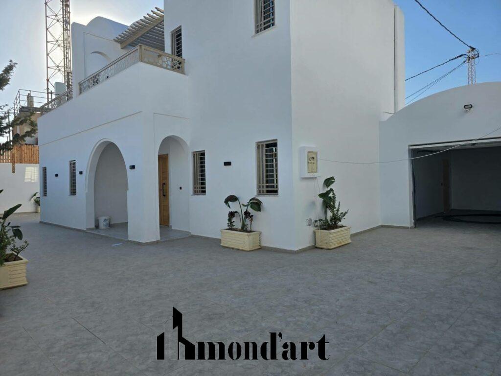 Superbe villa neuve, entièrement climatisée, située dans un quartier calme de Midoun, à seulement 10 minutes en voiture de la plage. Idéale pour une location annuelle, elle offre confort, modernité et tranquillité.