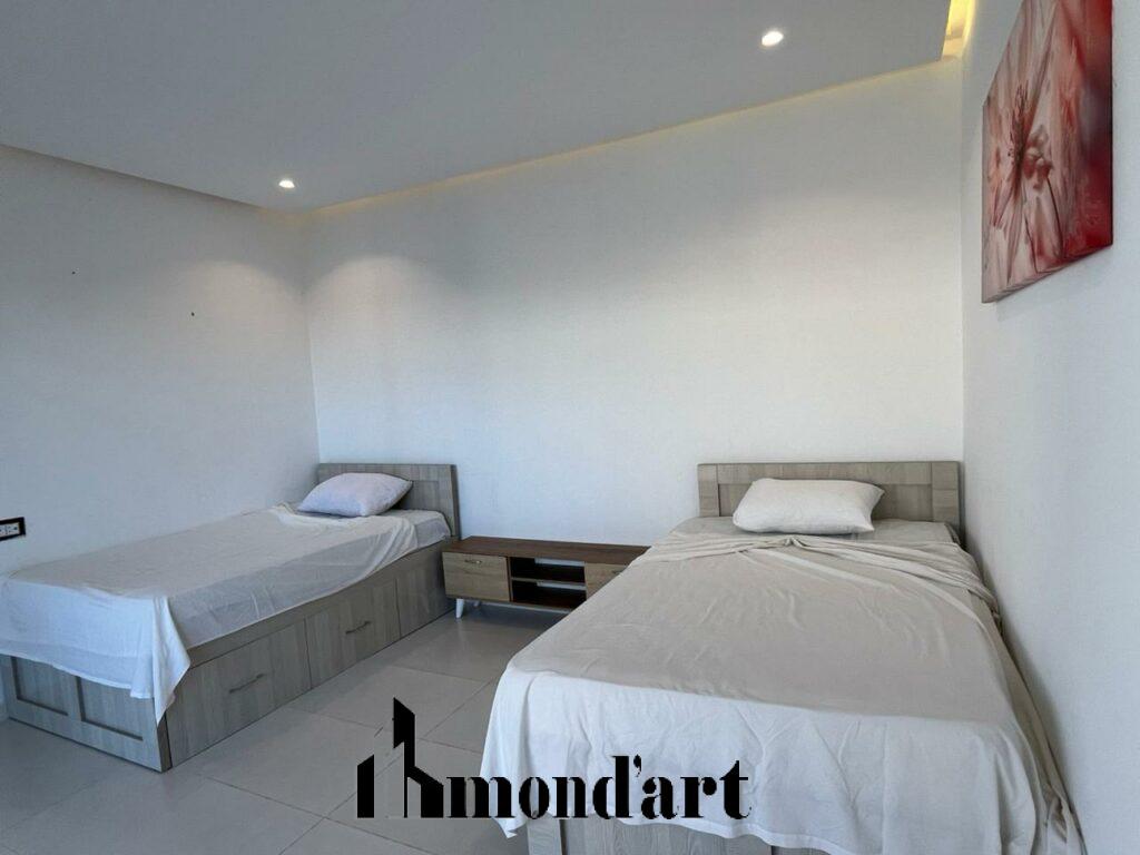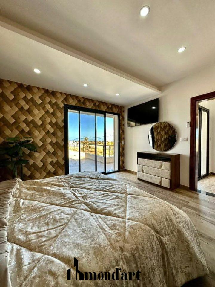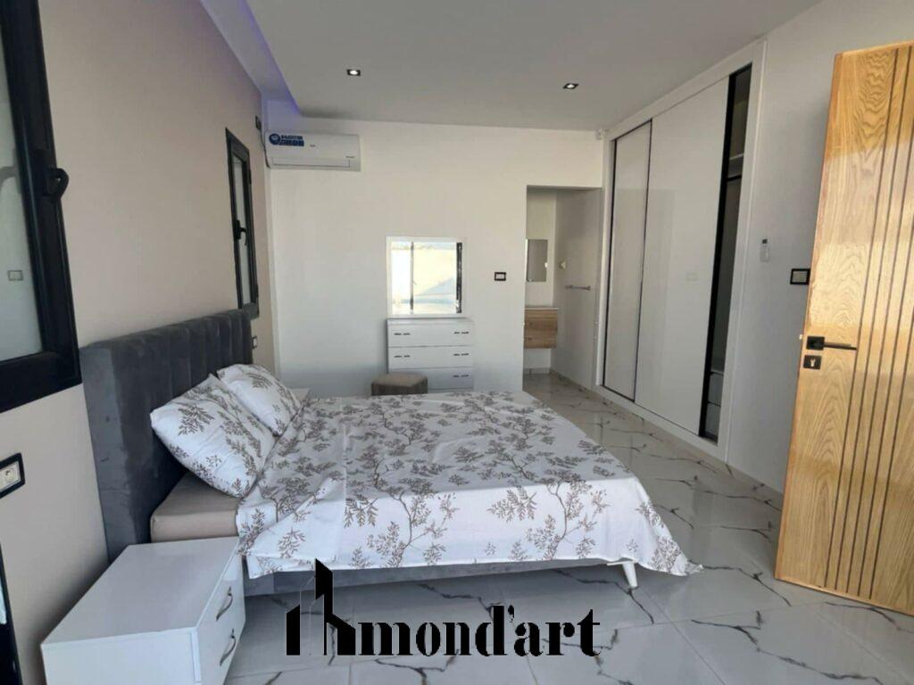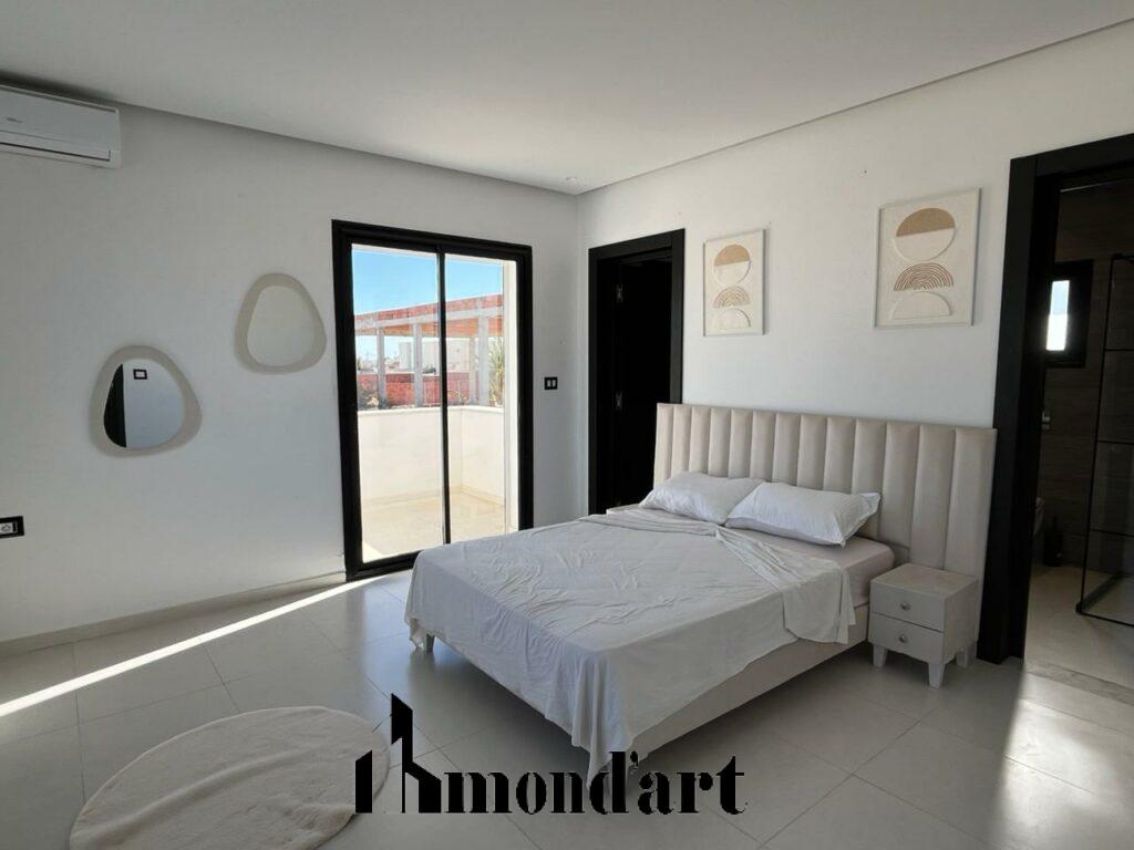 Cette superbe villa neuve, située sur la route d’Aghir, à seulement 7 minutes de la plage en voiture et en deuxième position sur la route, est entièrement meublée et édifiée sur un terrain de 780 m². Elle offre un cadre de vie alliant confort, modernité et élégance. Le rez-de-chaussée comprend un grand salon lumineux, une cuisine entièrement équipée, une chambre ainsi qu’une salle d’eau. À l’étage, la villa dispose de deux suites parentales avec accès à une agréable terrasse. À l’extérieur, vous profiterez d’un espace parfaitement aménagé comprenant une piscine avec cascade, une salle de bain extérieure, un garage et un espace barbecue, idéal pour les moments de détente et de convivialité.